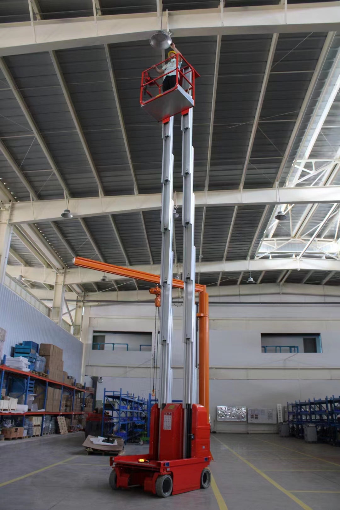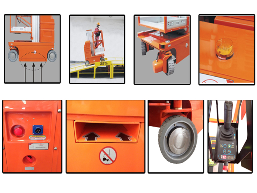 4傾斜報警:獨特的平臺超負荷壓力感應報警自鎖系統,2°傾斜警示保護,傾斜報警在傾角過大時能及時提醒作業人員,報警同時切斷提升和行駛電源。